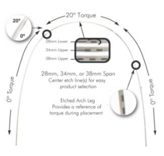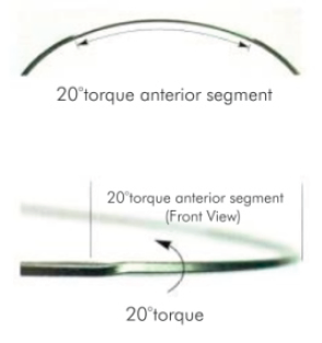 -El arco cuenta con 20° de torque estándar incorporado en la región anterior, ya sea en arcos superiores o inferiores.